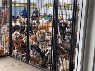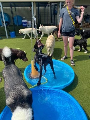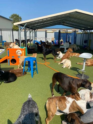 The kennels are made of anti-bacterial material, with the smallest (4' x 6') to the largest (20' x 30') provided with stainless steel water bowls and fleece blankets upon request for the raised bedding area. All dogs boarding have daily (7 days a week) daycare with the other dogs to expend energy, and potty breaks that mirror your home routine. They get to spend a relaxing night in their personal kennel before they up and off to daycare the next morning!